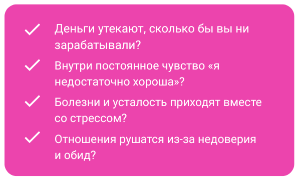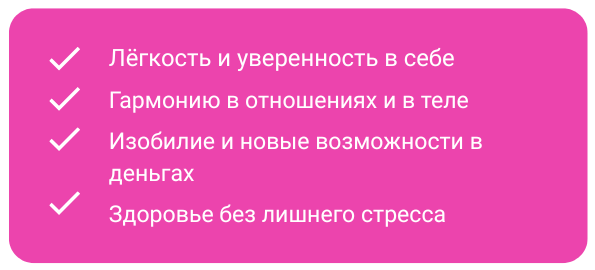 👍 Идеально для тех, кто хочет избавиться от страхов и зажимов, повысить уверенность и полюбить себя, научиться привлекать деньги и изобилие, перестать болеть «на нервах» и жить в гармонии.