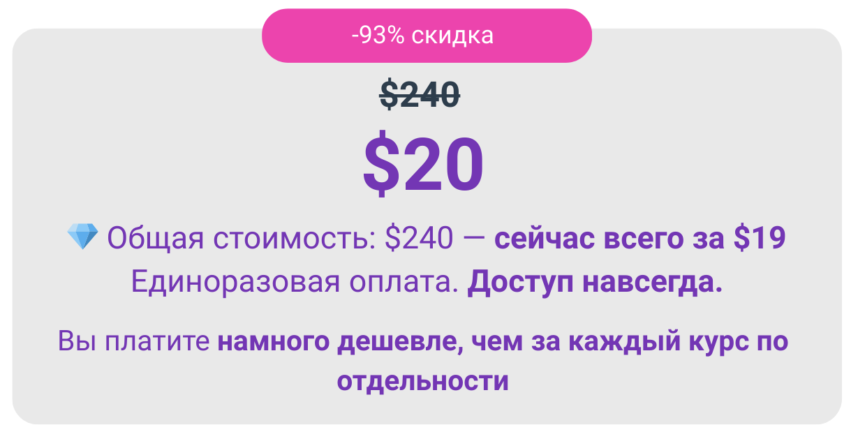 Вы можете выбрать любой курс всего за $10 из нашего набора или забрать весь набор курсов за $20. Сделайте свой выбор.